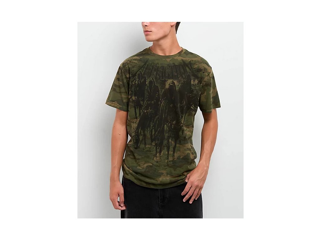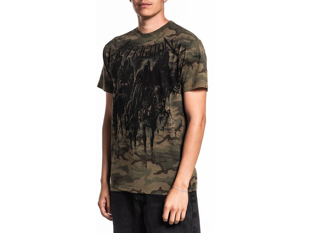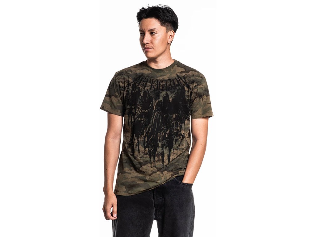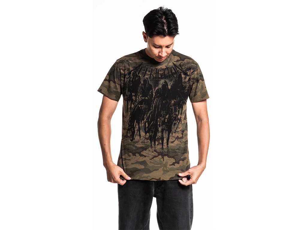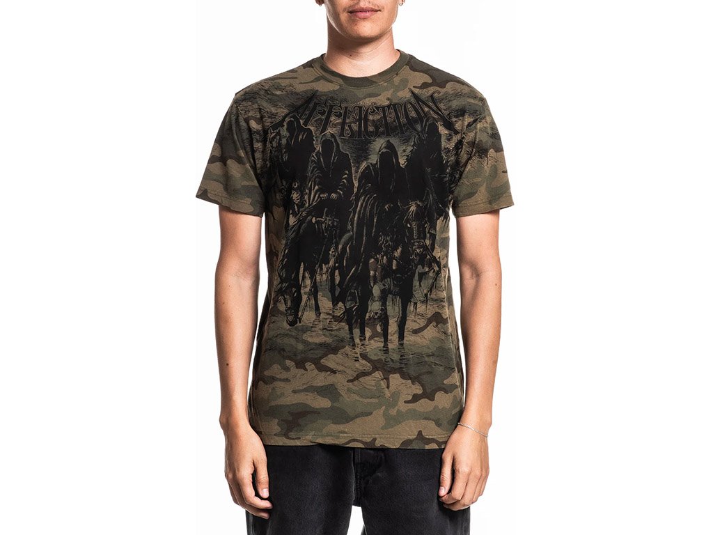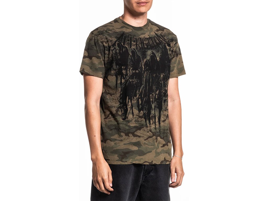 The Affliction Black Night Green Tee features a camo base with bold, dark graphics of hooded riders and signature branding. Made from soft cotton with a ribbed crewneck for all-day comfort.