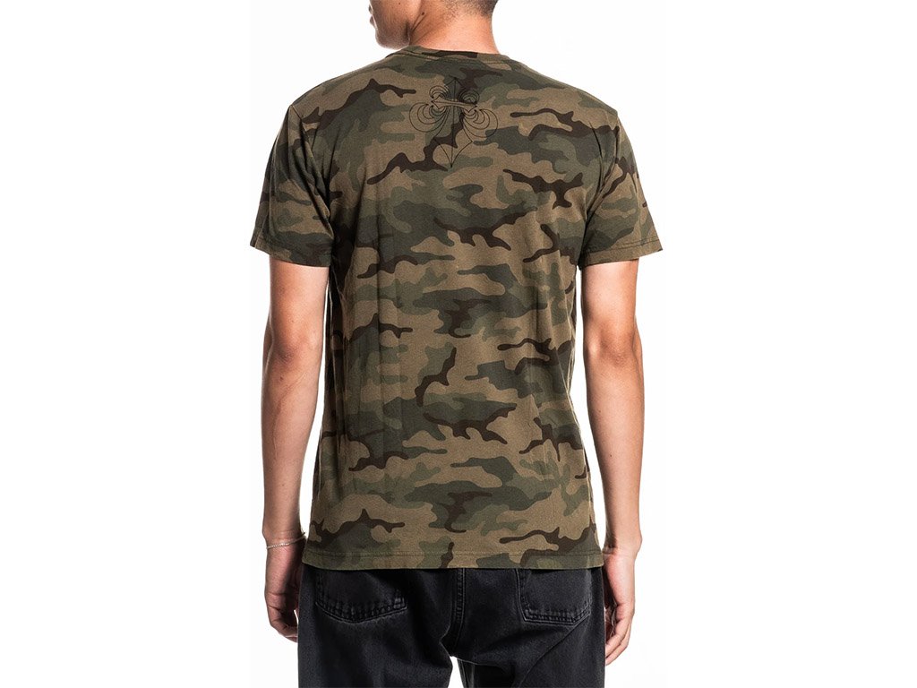 The Affliction Black Night Green T-Shirt delivers a striking blend of mystery and bold design. Featuring a camo-inspired base, the tee showcases haunting black graphics, including hooded riders on horseback charging beneath iconic Affliction branding. A fleur-de-lis emblem on the upper back adds a refined gothic touch.
