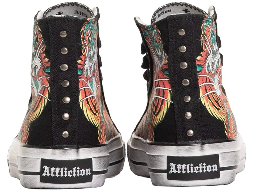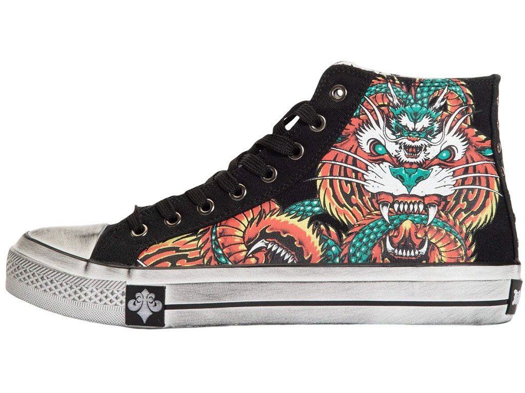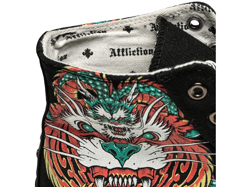 The Flame & Fable high-top shoes from Affliction feature a black vulcanized canvas upper with bold red and yellow sublimated graphics on the sidewalls. The detailed artwork depicts a fierce mythical combination of a tiger and dragon, creating a striking and artistic statement. Lightweight yet durable, these sneakers are accented with white Old English branding on the tongue for a tough, edgy finish. The vintage stain-smear treatment on the outsole foxing gives a worn, distressed aesthetic, completing the alternative streetwear vibe.