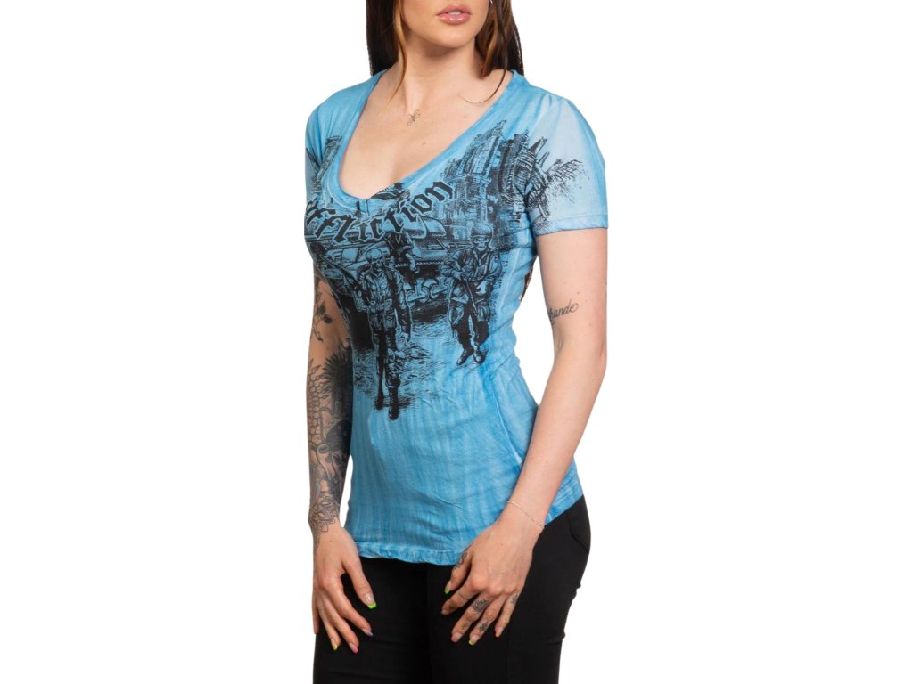 The women's t-shirt Affliction Ghost Army is light blue, with short sleeves and a V-neckline.