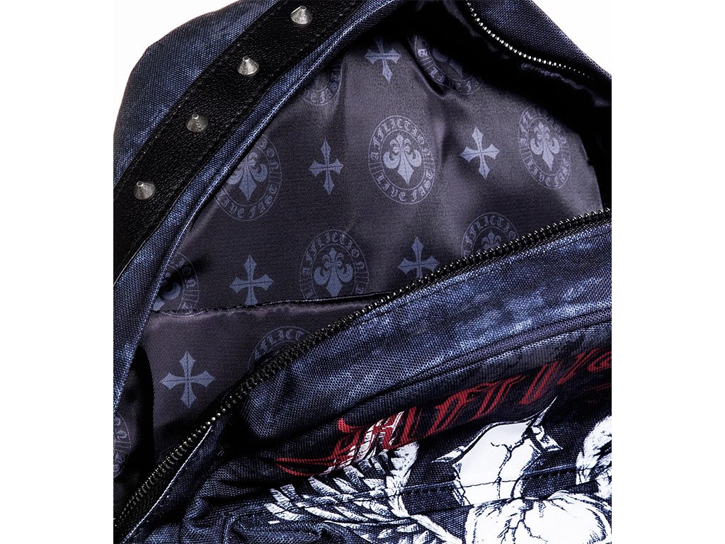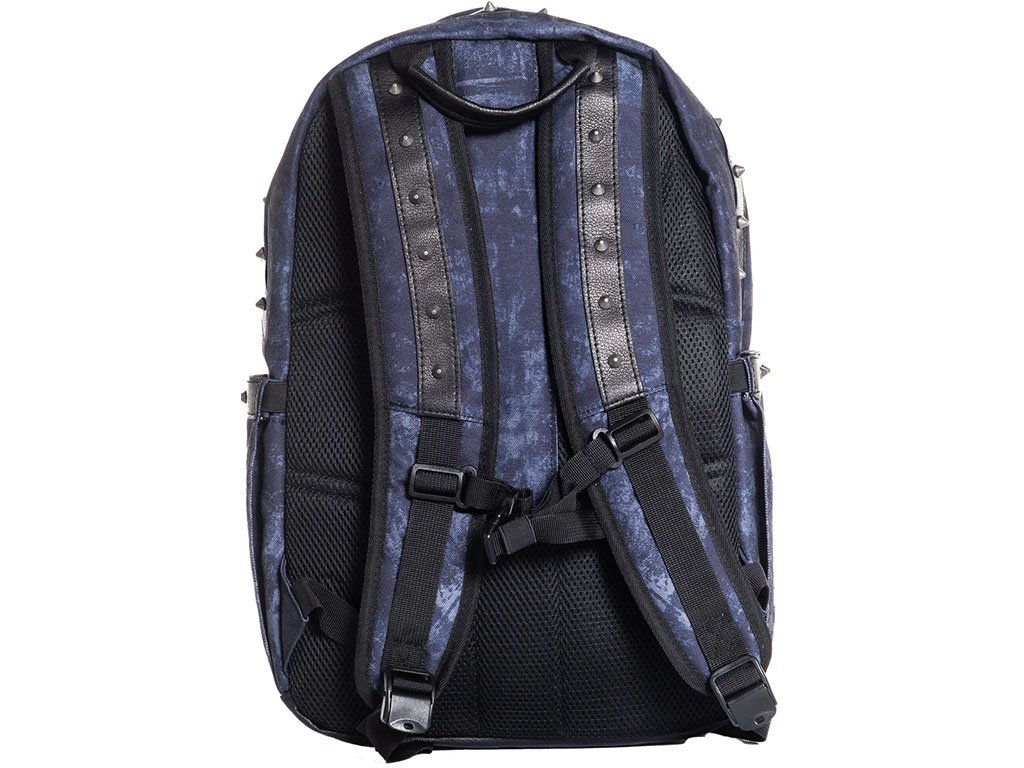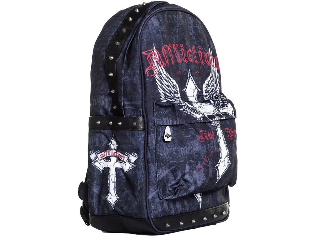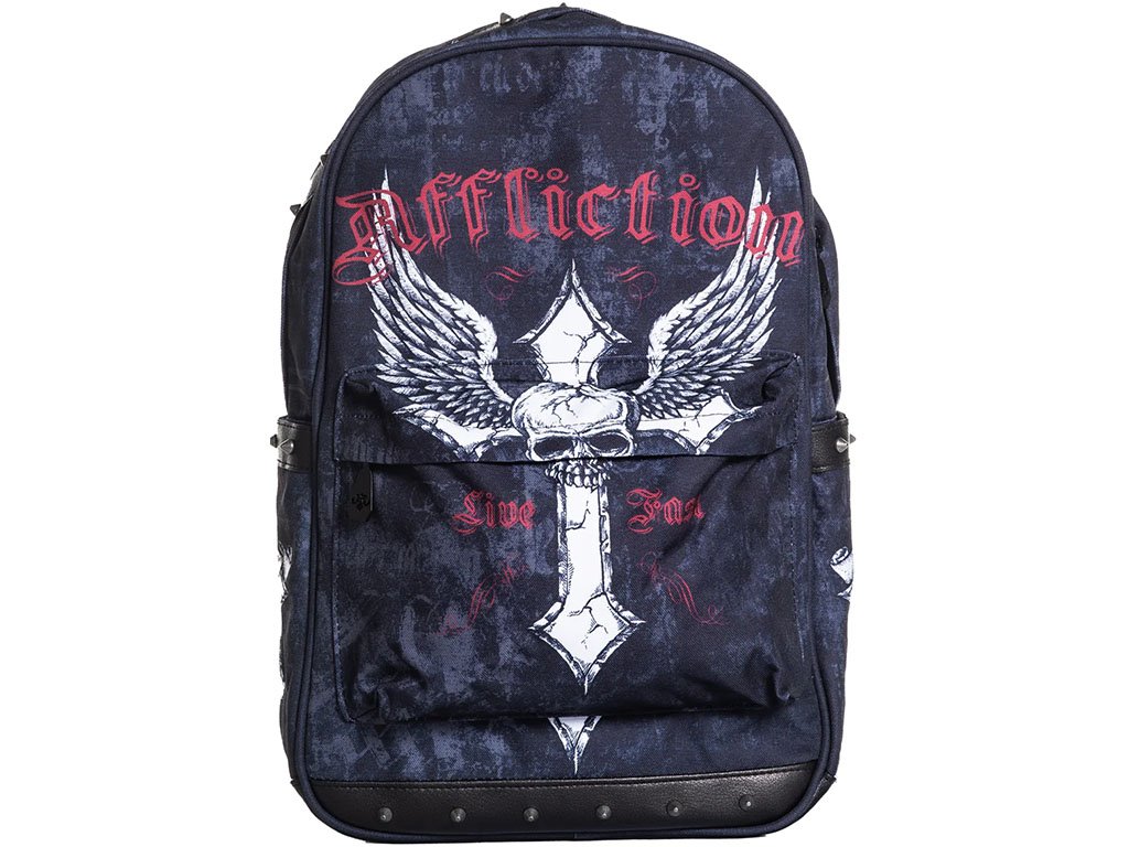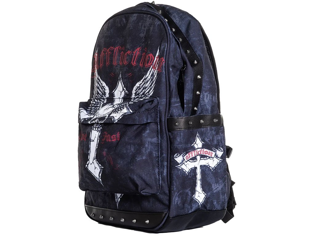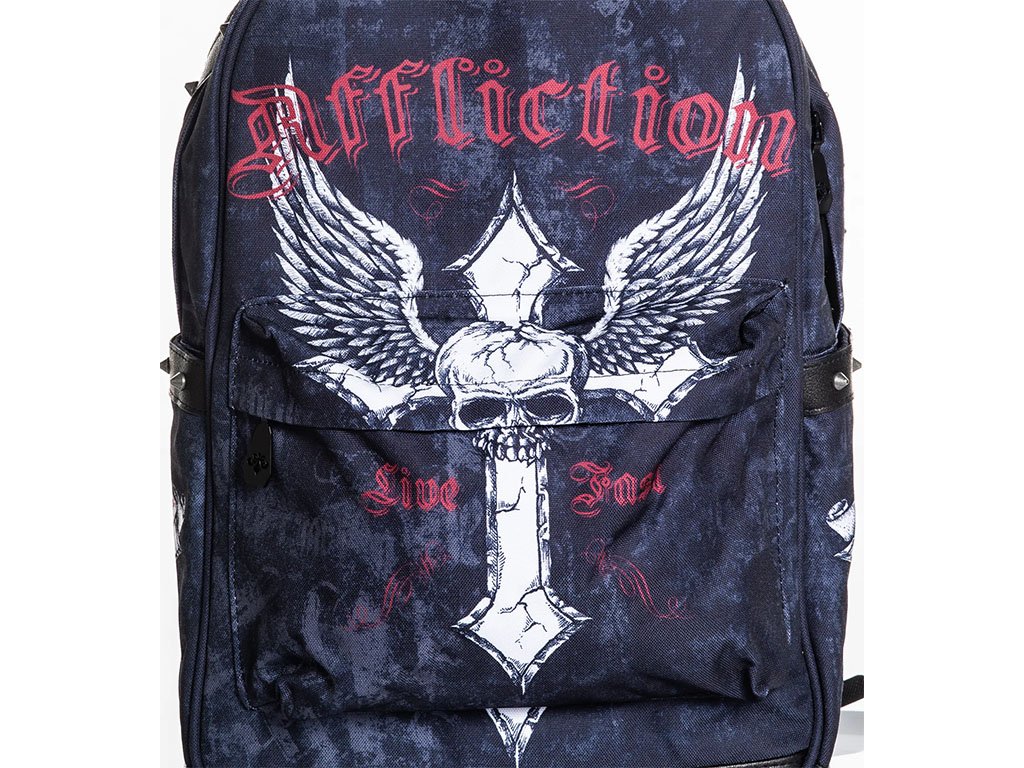The Affliction Live Fast Backpack in black features sublimated artwork, cone-shaped studs, and custom black metal zipper pulls for a bold, edgy design.