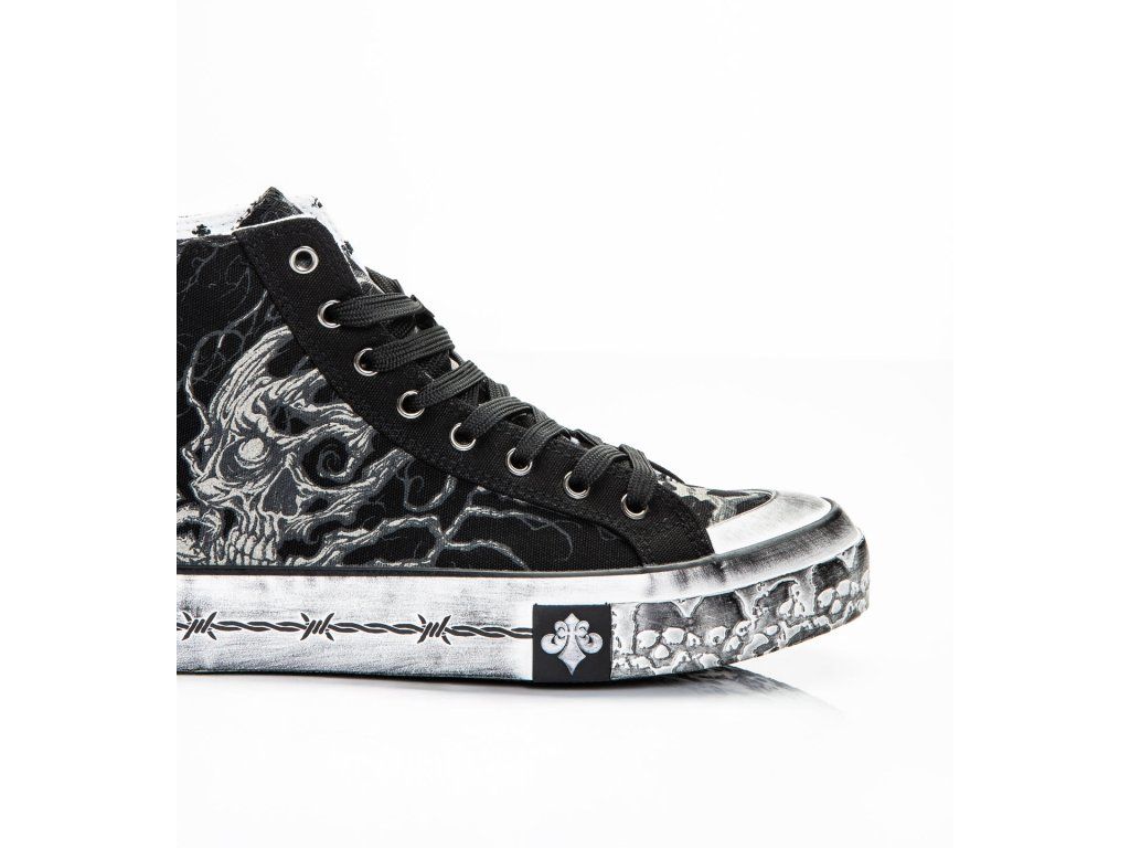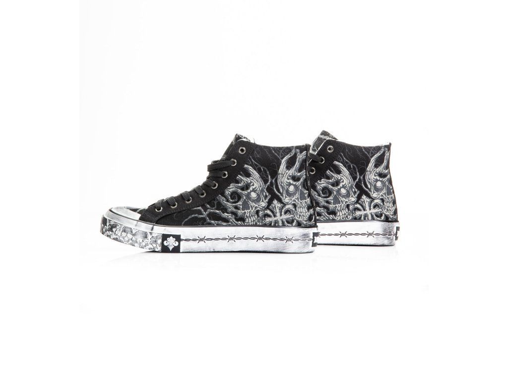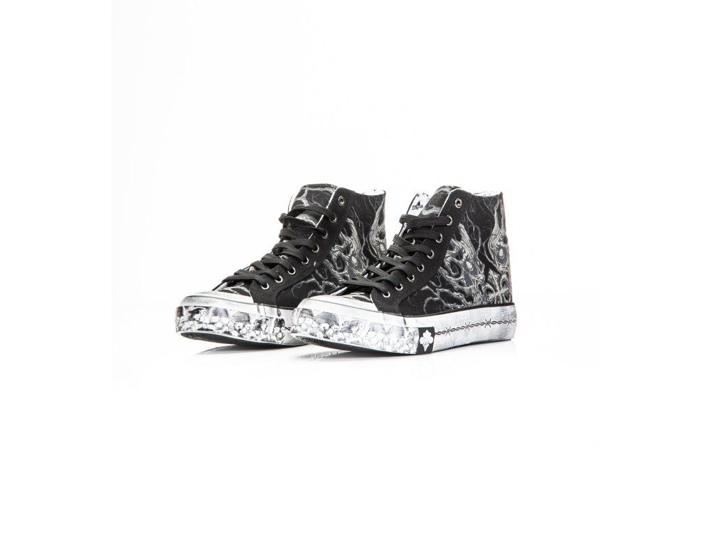 The high-top silhouette provides added ankle support while maintaining a classic sneaker profile. Details include black laces, antique silver eyelets, decorative heel studs, logo branding on the tongue, and bold artwork over the toe cap.