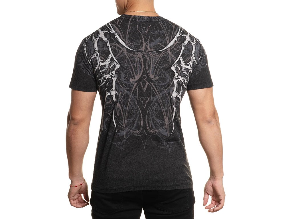 Scattered skeleton bone graphics create a dark artistic vibe, while the iconic Affliction logo script completes the look with unmistakable attitude. Versatile and expressive, this graphic tee elevates any casual outfit with its unique blend of artistry and edge.