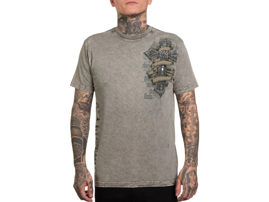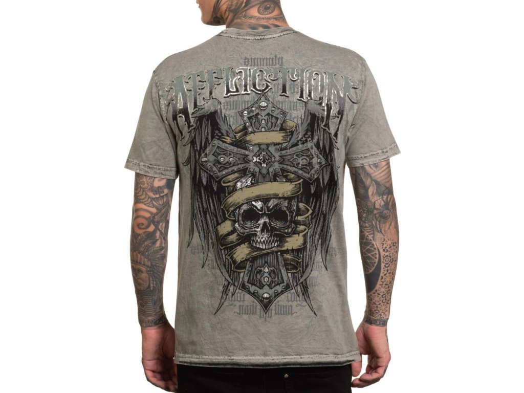 Reversible T-shirt - two in one, with stylish Affliction prints on both sides. The main side is also decorated with silver metallic foil, adding shine in places.