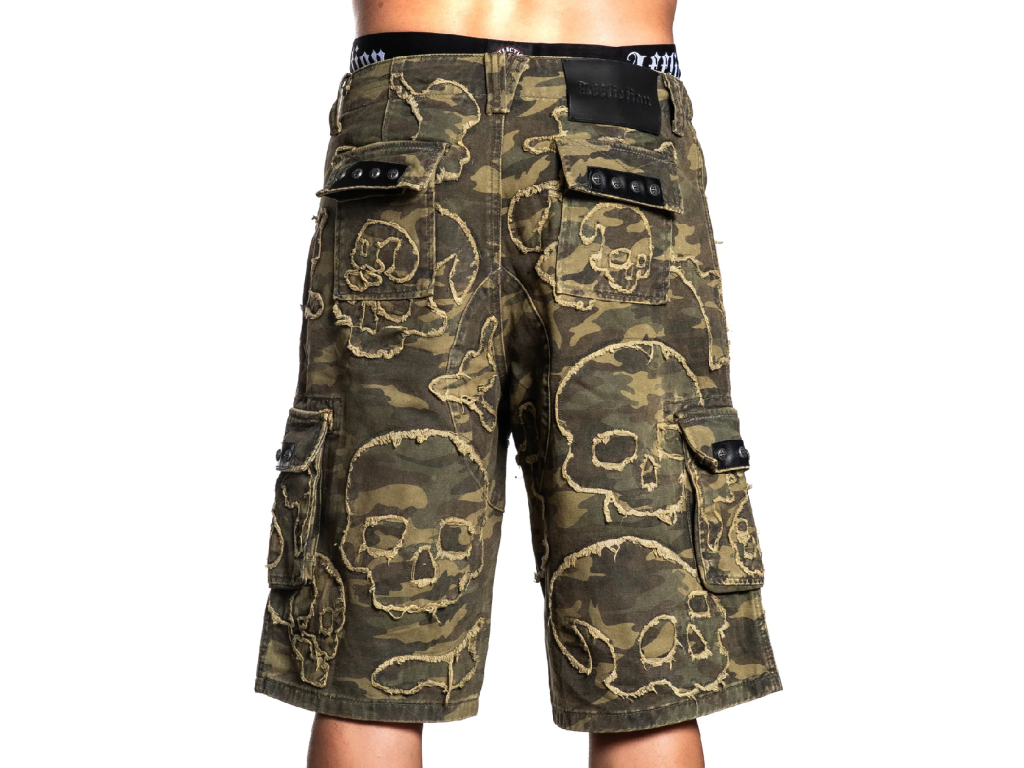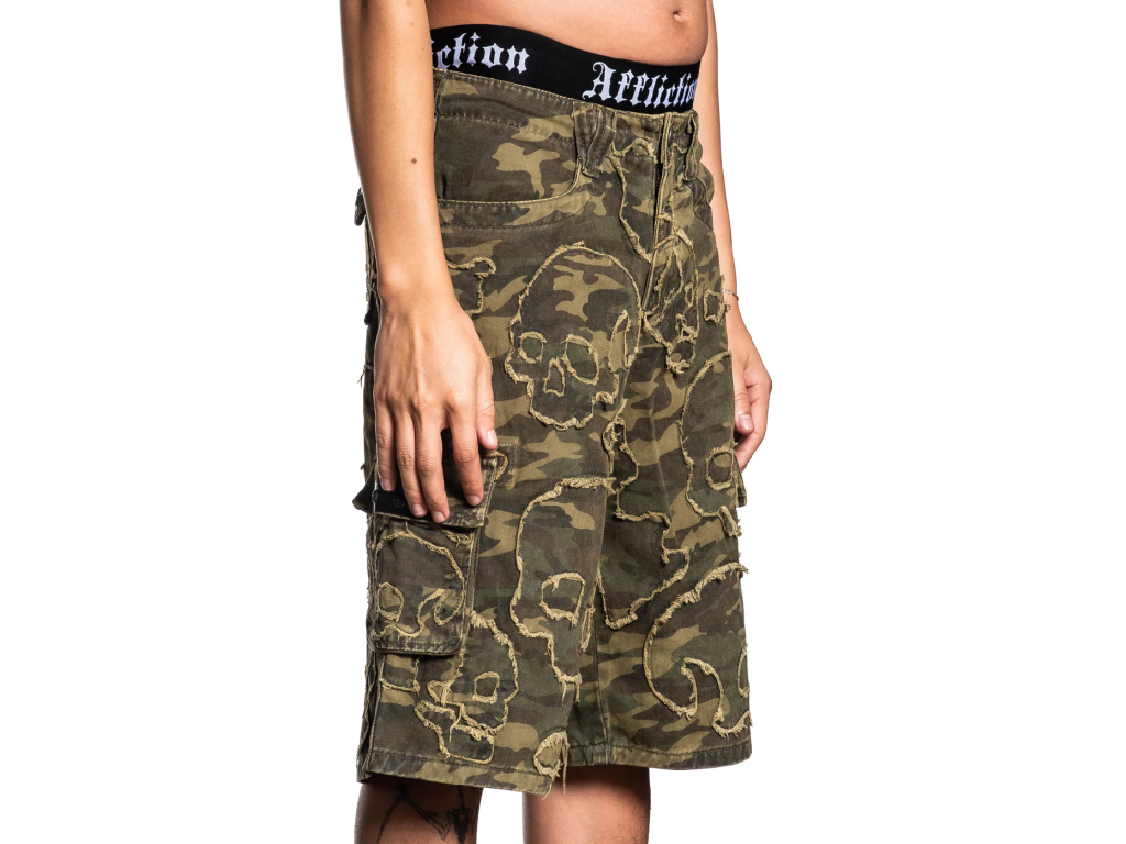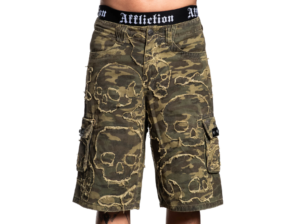 Affliction Wide Leg Skull Camo Shorts - Green Camouflage