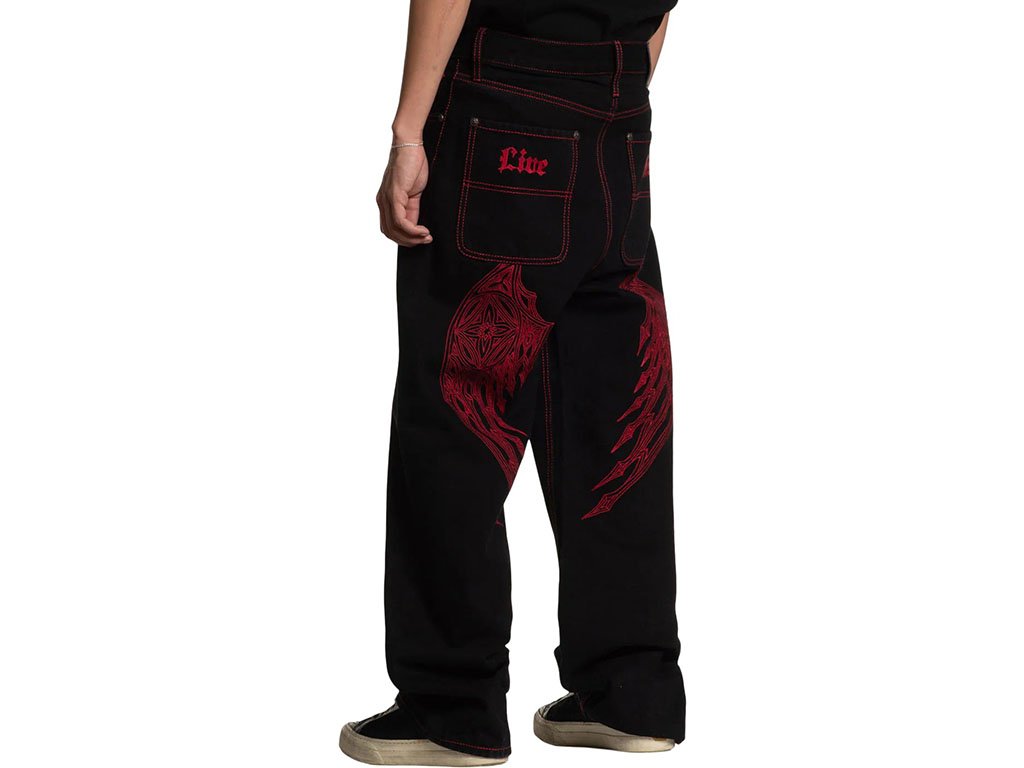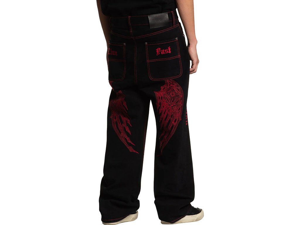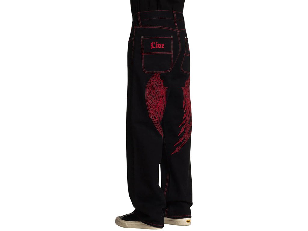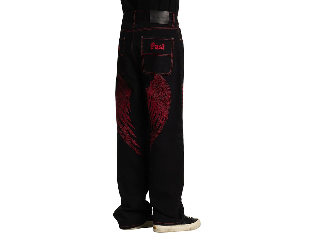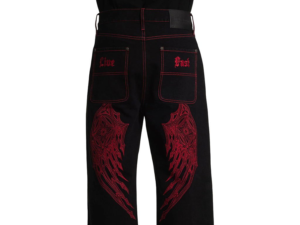 These wide-leg pants are crafted from 100% cotton for breathable comfort with a rigid stretch that ensures durability and a structured fit. The 32” inseam provides a relaxed, modern silhouette. Finished in Raw Black with rinse-only treatment, they feature striking red stitched wings along the sides for a bold statement. Designed for a contemporary wide-leg style, these pants combine edgy graphics with classic tailoring.