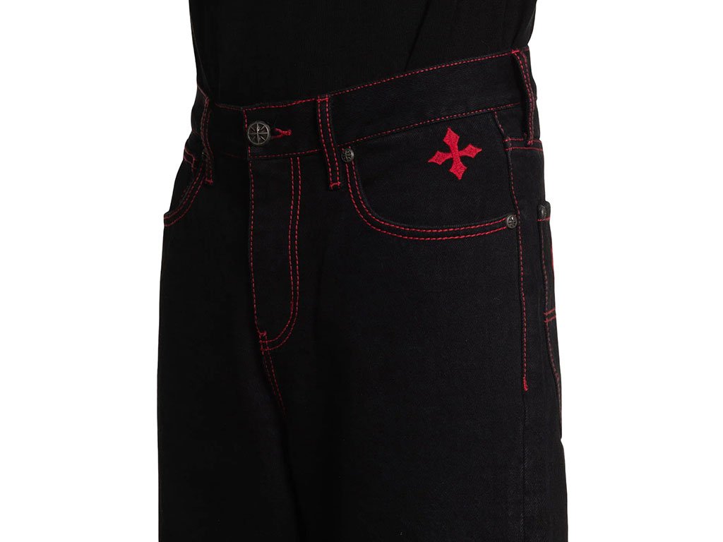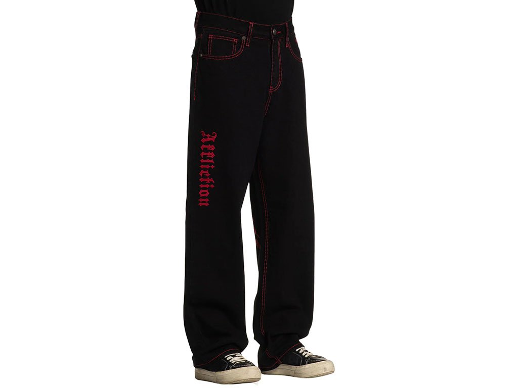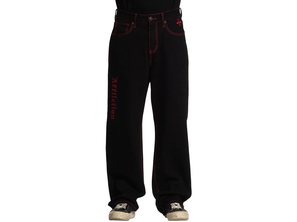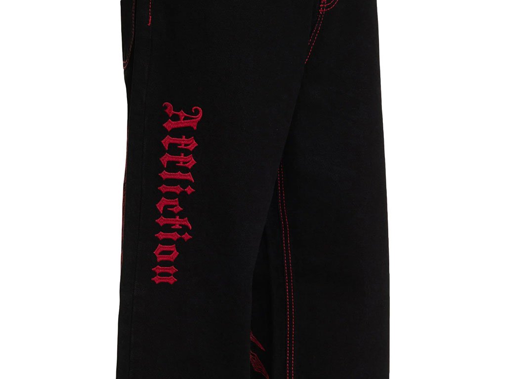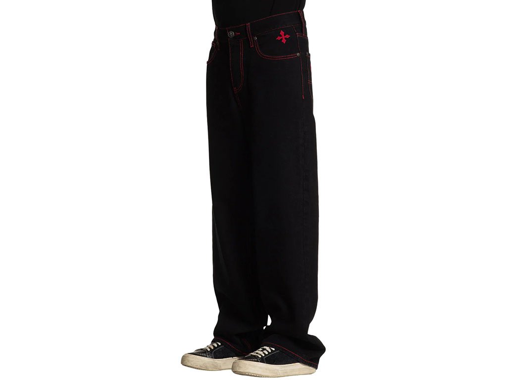 These wide-leg pants are crafted from 100% cotton for breathable comfort with a rigid stretch that ensures durability and a structured fit. The 32” inseam provides a relaxed, modern silhouette. Finished in Raw Black with rinse-only treatment, they feature striking red stitched wings along the sides for a bold statement. Designed for a contemporary wide-leg style, these pants combine edgy graphics with classic tailoring.