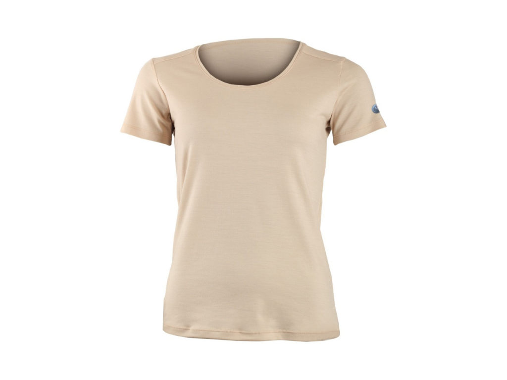 The shirt features a comfortable women's fit, set-in short sleeves, and flat seams for enhanced comfort and reduced irritation during movement. Ideal as a base layer for hiking, travel, training, or casual everyday use.