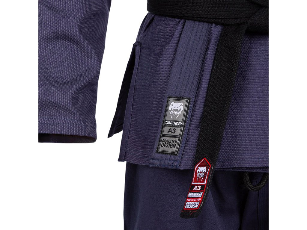 The trousers are constructed from 230 gsm pre-shrunk cotton and reinforced along the inside of the legs and ankle cuffs to withstand intense training. An easy-tie secure belt system and optimal moisture management enhance comfort and performance. Finished with a bold Venum logo across the back of the lavender grey jacket, the Contender 2.0 makes a strong statement on the mats.