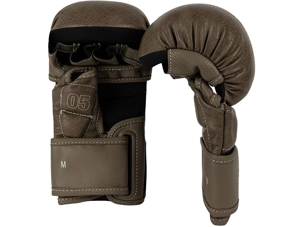 Inside, a neoprene lining promotes moisture evaporation and delivers a firm grip during grappling exchanges. The anatomical shape is enhanced by subtle beige stitching, adding contrast and highlighting the glove's structure. The textured "scales" surface adds a signature Venum touch — symbolizing speed, strength, and precision.