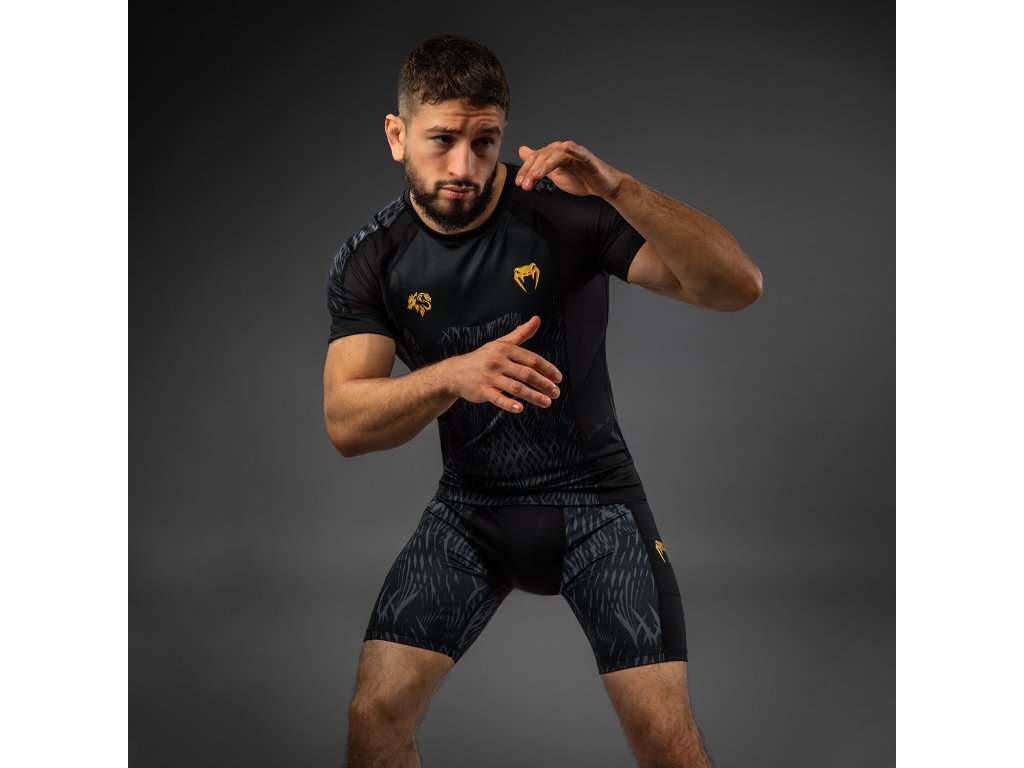 Inspired by the spirit of the wolf (“Borz” in Chechen), the Venum x Chimaev collection embodies Chimaev’s relentless drive and Venum’s commitment to high-performance gear. With its black-grey-gold palette and premium technical materials, the collection is engineered to withstand the daily grind of elite training.