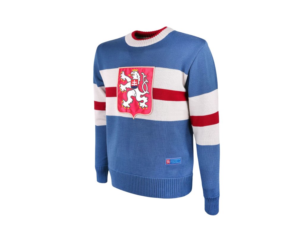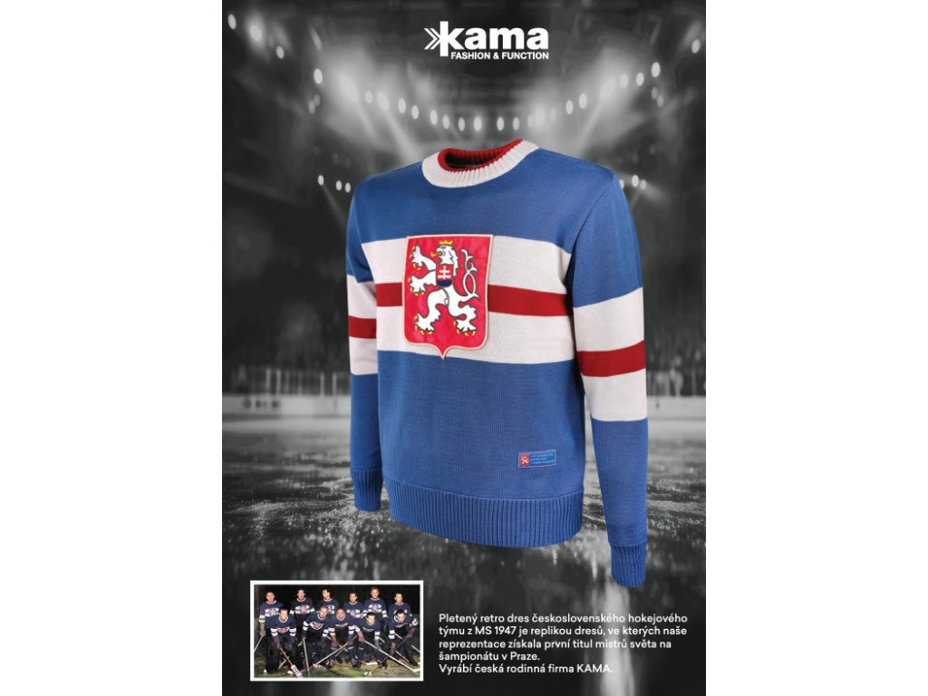 Pletený retro dres československého hokejového týmu z MS 1947 je věrnou replikou dresů, ve kterých naše reprezentace vyhrála zlatou medaili. Fanděme současným hokejistům tímto klenotem mezi svetry, který je vzpomínkou na první zlatý úspěch československého hokeje v mezinárodním měřítku. Svetr je upleten z kvalitní směsové příze Merino vlna/akryl. Na prsou je vyšívaný státní znak ČSR z r. 1947. Vyrábí česká rodinná firma KAMA.
