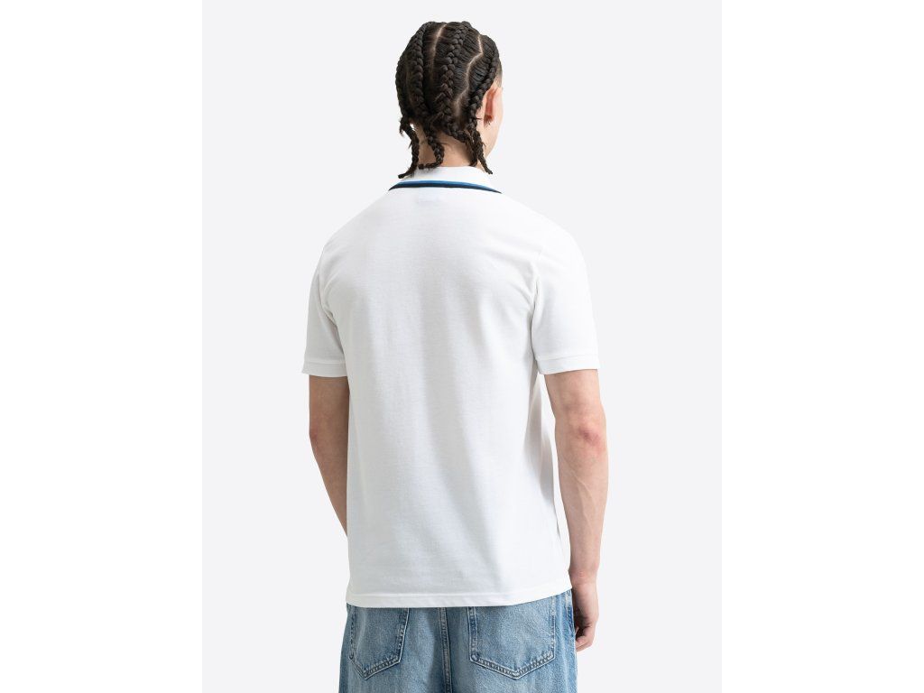 Klasický límeček doplňují kontrastní proužky, stejně jako žebrované manžety rukávů. Na levé straně hrudi se nachází malé logo, které podtrhuje čistý a nadčasový vzhled modelu.
