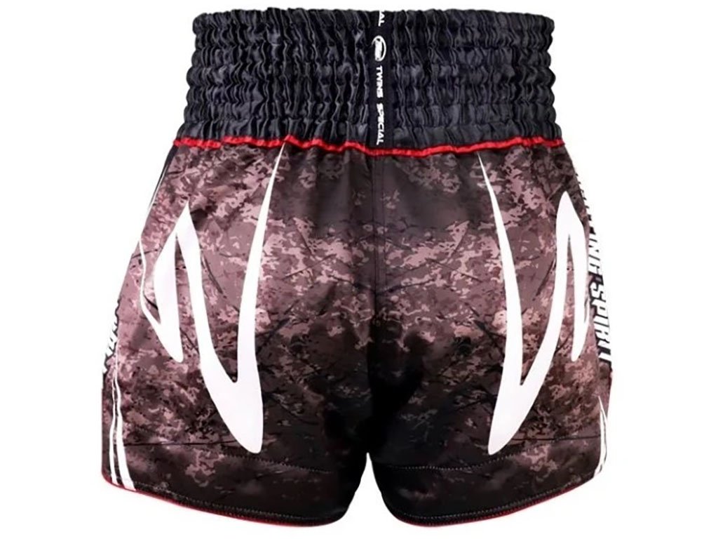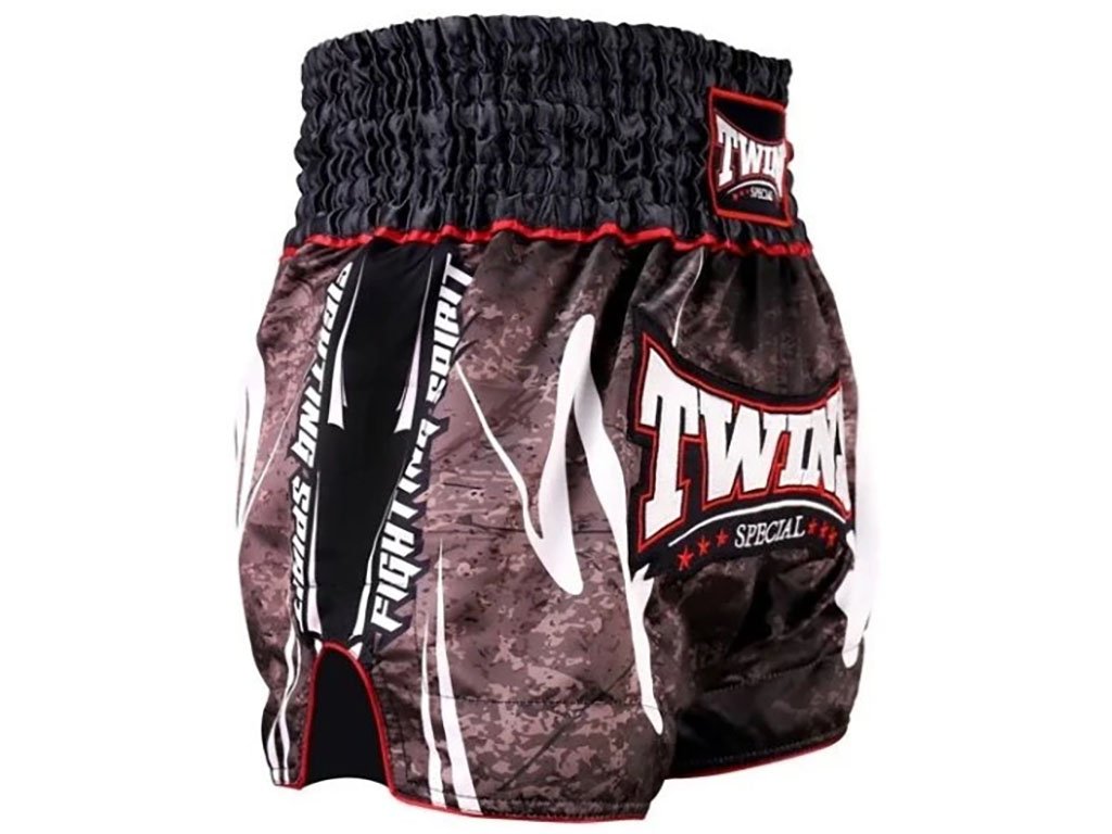 Široký osmipruhový elastický pas se stahovací šňůrkou zajišťuje pevné a pohodlné usazení. Boční rozparky poskytují maximální volnost pohybu při kopech, kolenech i klinči. Výrazný maskáčový design s vyšívaným logem Twins Special dodává trenkám jedinečný vzhled.