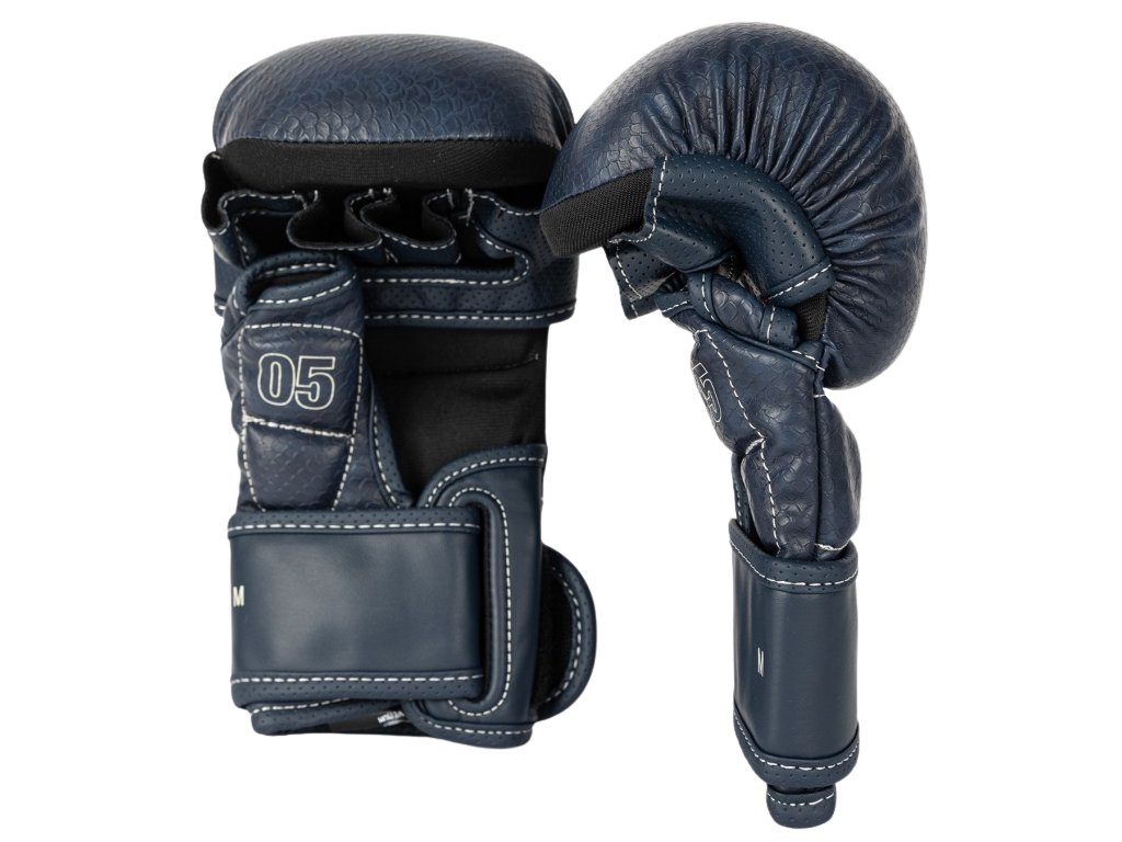 Profesionální MMA rukavice z odolné umělé kůže, s oddělenými prsty, otevřenou dlaní, silně polstrovanými klouby a širokým zapínáním na suchý zip.