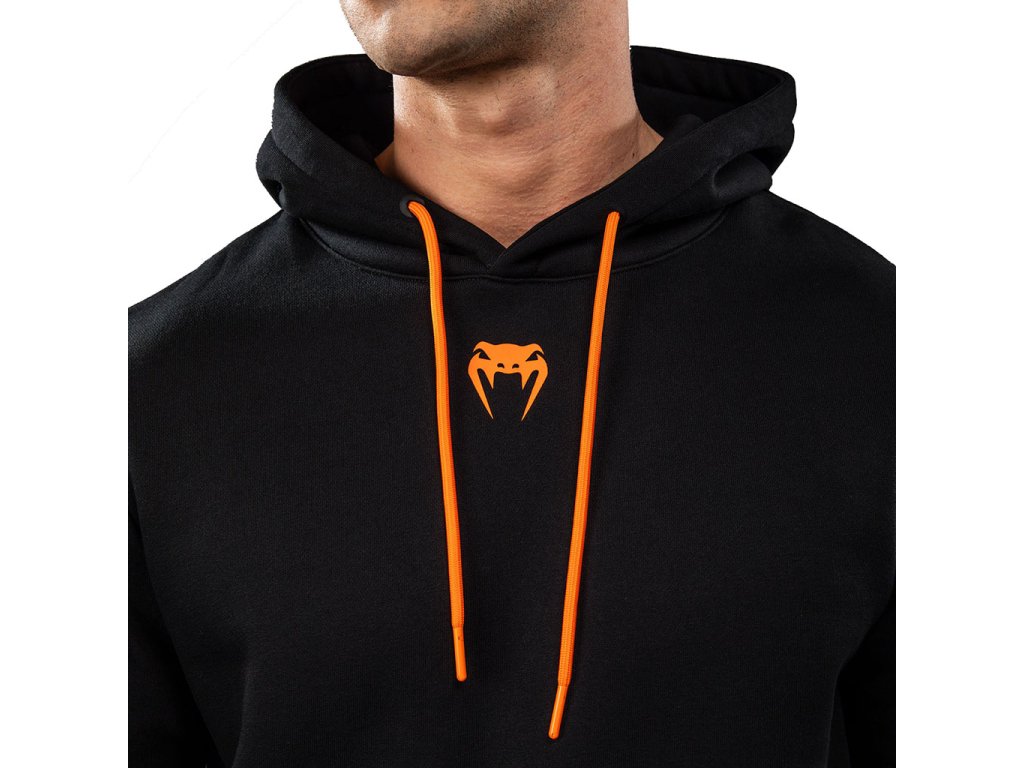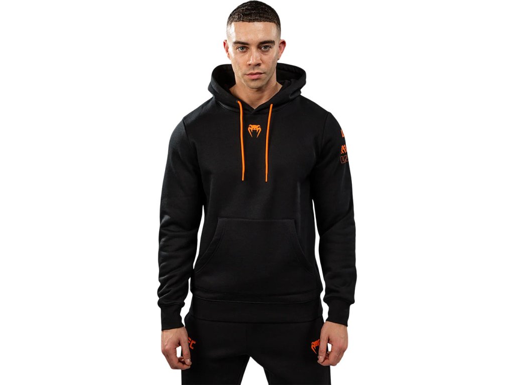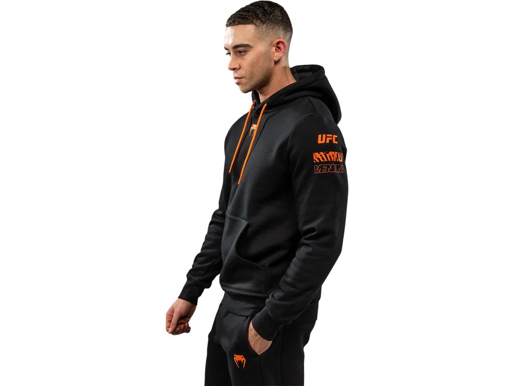 Výrazné logo UFC a Venum je umístěno na hrudi, levém rukávu a zadní části pravého ramene, čímž mikina získává autentický Fight Week charakter. Praktická klokanková kapsa nabízí prostor pro ruce či drobnosti, zatímco kapuce se stahovací šňůrkou umožňuje individuální nastavení. Celkový vzhled doplňují sítotisková loga a čisté zpracování.