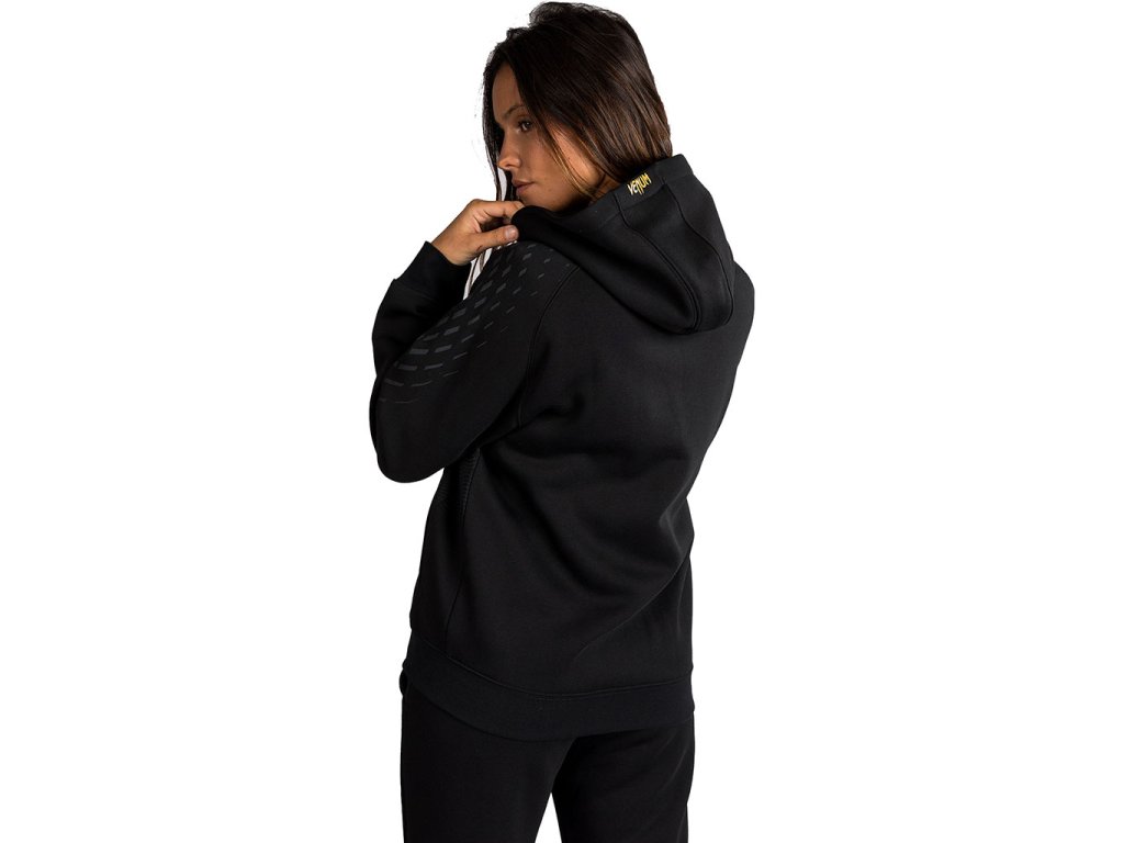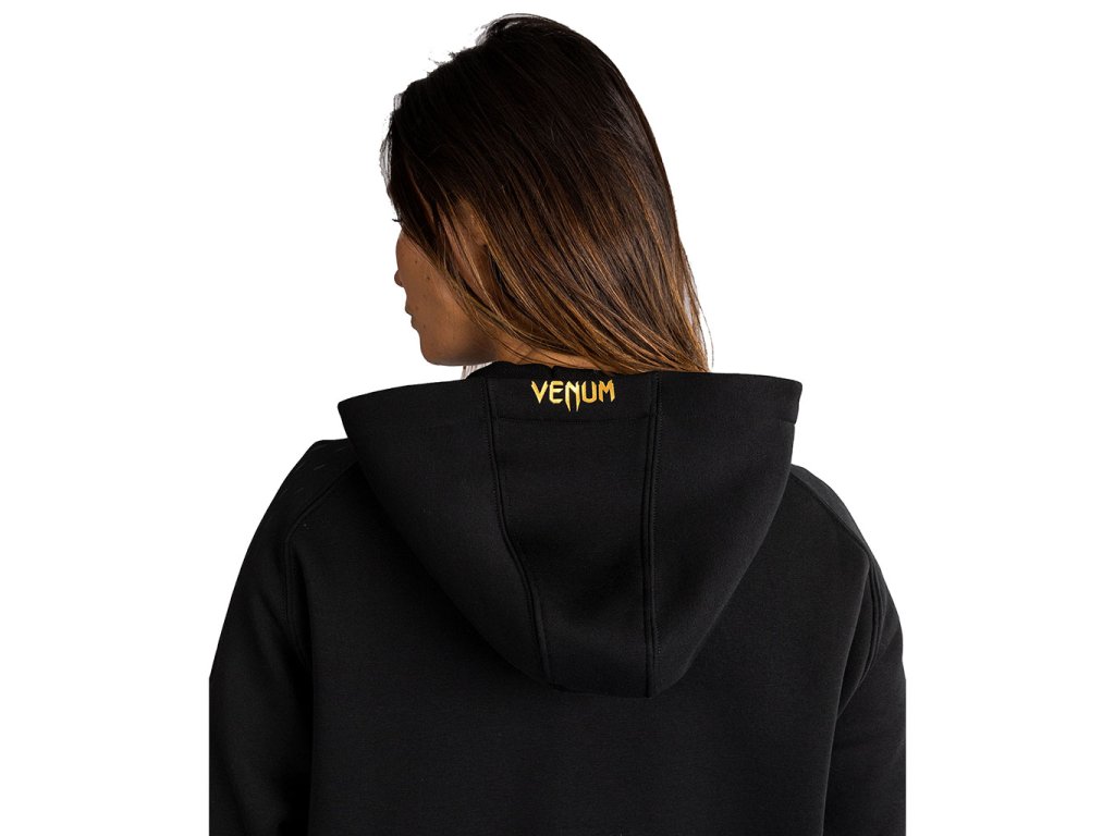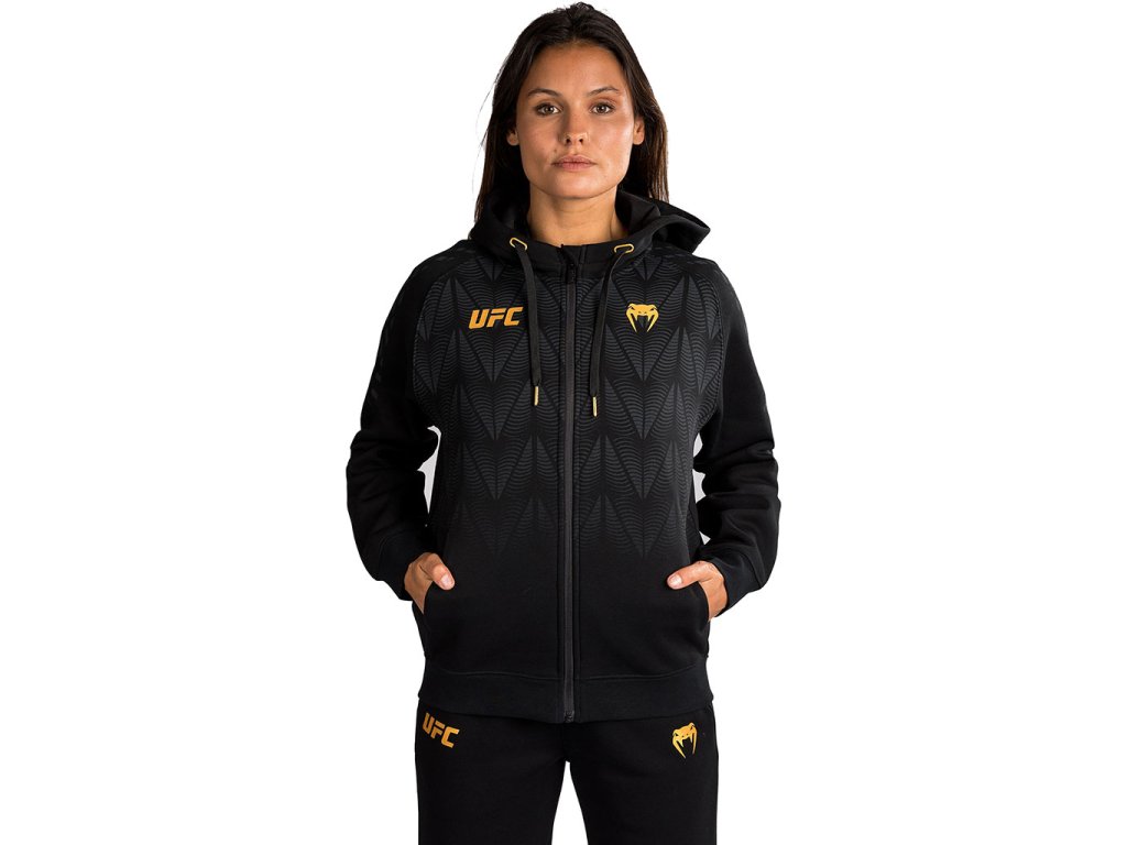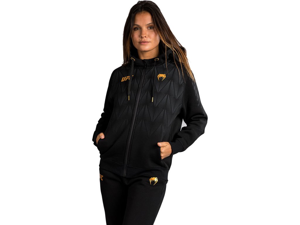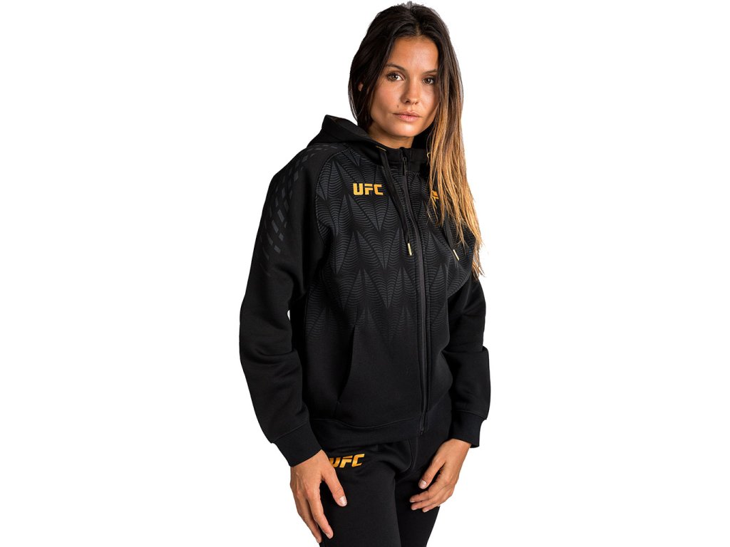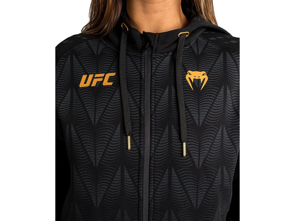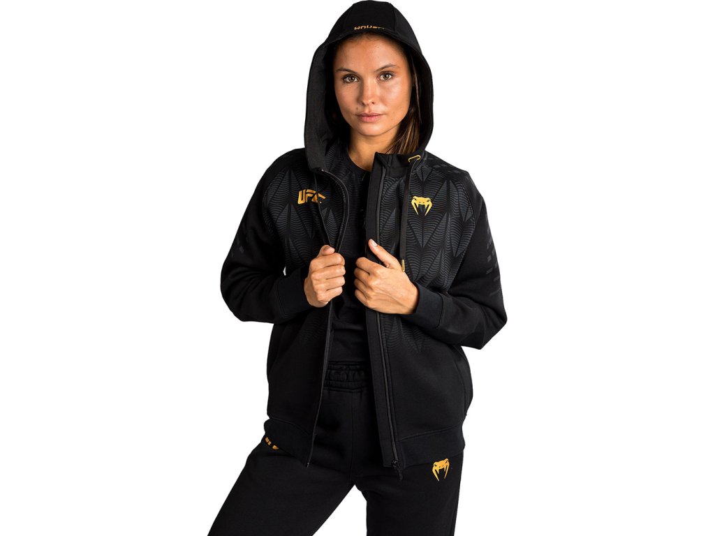 Dámská mikina je vybavena celopropínacím zipem, otevřenými bočními kapsami a kapucí se stahovací šňůrkou, což zajišťuje pohodlí při tréninku, cestování i běžném nošení. Exkluzivní černo-zlaté barevné provedení je vyhrazeno pouze UFC šampionům a symbolizuje nejvyšší úroveň bojových sportů.